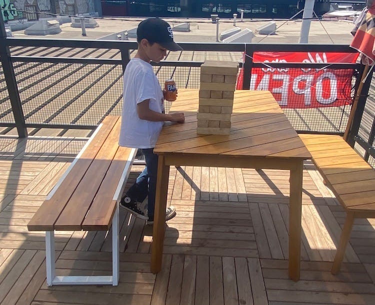 I took my 9-year-old son, Cruz, to check out WonderLove for lunch on a Tuesday. While waiting for our lunch, Cruz and I explored the pod that spanned half a city block. The second story of the storage-container building had a bank of televisions and cushy club chairs around tables. But the breezy rooftop area was extra fun. We took in the views of the neighborhood and downtown. One of the tables had a giant Jenga game on it.