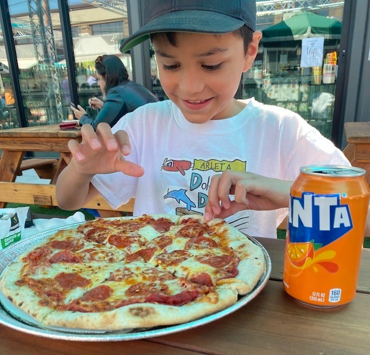 Some of the carts Cruz had been excited to try, Honeycuspe waffles and The Electric Slider Co., were closed. After we made the rounds of all the open carts (there are currently 10 carts in the space), he decided on a pepperoni pie ($15) from Wondercat Pizza. “It’s the kind of pizza I like because it’s got lots of mozzarella on top and you can’t see the sauce,” he said. The personal-sized pizza is big enough for a kiddo to split with someone — or eat leftovers for dinner, which Cruz did.