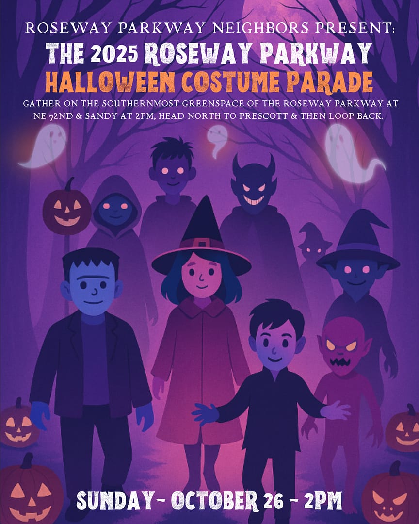 Roseway Parkway NE 72nd & SandyROSEWAY PARKWAY NEIGHBORS PRESENT: THE 2025 ROSEWAY PARKWAY HALLOWEEN COSTUME PARADE GATHER ON THE SOUTHERNMOST GREENSPACE OF THE ROSEWAY PARKWAY AT NE 72ND & SANDY AT 2PM, HEAD NORTH TO PRESCOTT […]