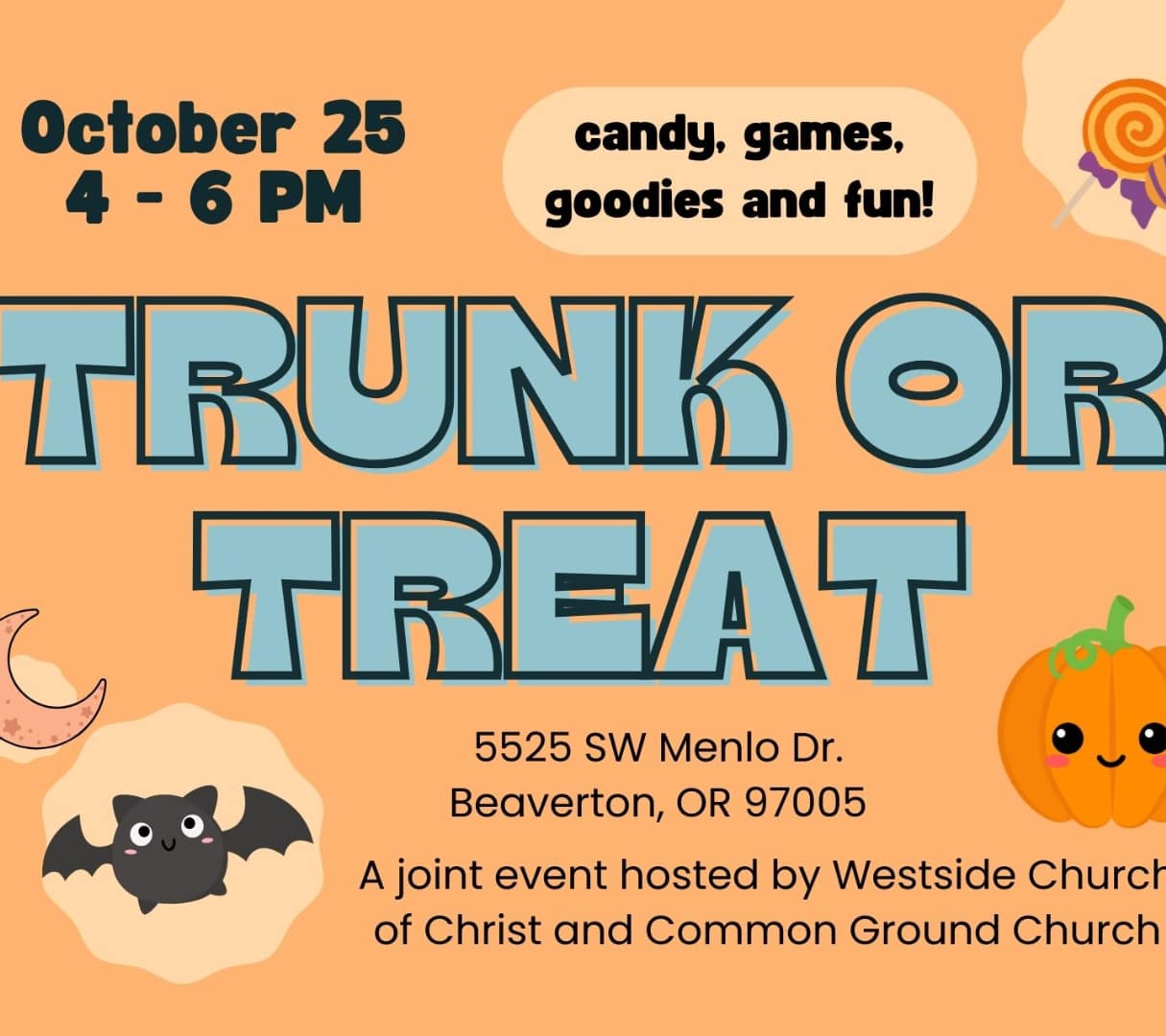 Westside Church of Christ 5525 SW Menlo Dr., Beaverton, ORJoin for a fun celebration that includes trick-or-treating, games, and more! Those who wish to donate something are encouraged to bring new hygiene items for donation to Northwest Children's Outreach.