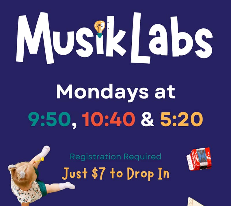 We provide the space and instruments and you do whatever moves you. MusikLabs are unstructured, all ages (we recommend 6 months – 9 years), and all abilities. Visit our website for details. Registration is required for each participant 17 years and under. Up to 2 grownups are welcome per registered participant. Please pre-register as spots are limited, we recommend registering 24 hours or more in advance. Mondays at: 9:50am; 10:40am; and 5:20pm*