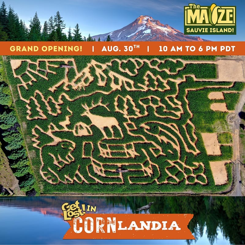 The MAiZE at The Pumpkin Patch, the premier destination for family-friendly entertainment and fall harvest bounty on Sauvie Island, is thrilled to announce the celebration of our “Cornlandia” themed corn maze.  This year’s Maize theme is a tribute to a wild harvest where nature, nostalgia, and northwest pride grow tall. For a quarter of a century, The MAiZE at The Pumpkin Patch has provided cherished memories and exhilarating adventures for visitors from near and far. We invite everyone to join us for a special season of festivities and fun, paying tribute to the land where elk roam, beavers build, salmon run, and Mount Hood watches over it all. This year’s Maize is a love letter to Portland’s untamed heart- celebrating the animals, land and spirit that make our corner of the world wildly special.