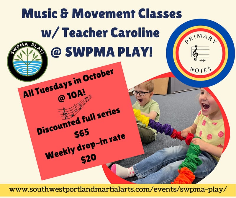 Join Teach Caroline, of Primary Notes for these fun-for-all and engaging “Music & Movement” class at SWPMA PLAY! @ 6315 SW Capitol Highway in Hillsdale Town Center. Drop-in rate of $20.