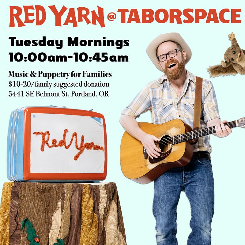 Red Yarn is thrilled to return to the beautiful Taborspace Sanctuary on Tuesday mornings for a weekly music & puppet show. Families are invited to come sing, dance, and experience the joy of community with Red Yarn & his lovable critter puppets.